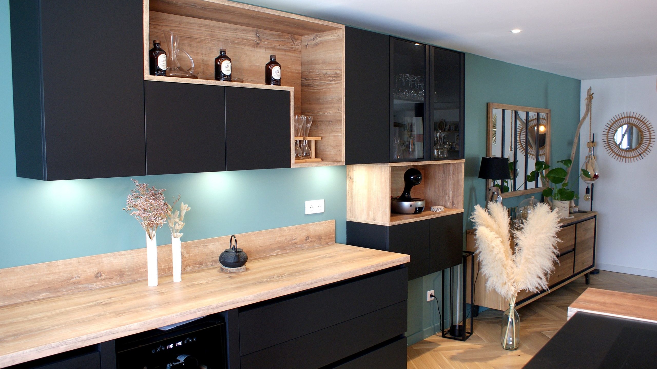 Nos clients ont fait le choix d’un modèle avec d’élégantes façades noires à gorge de chez Miton et un plan de travail décor bois Laisne.