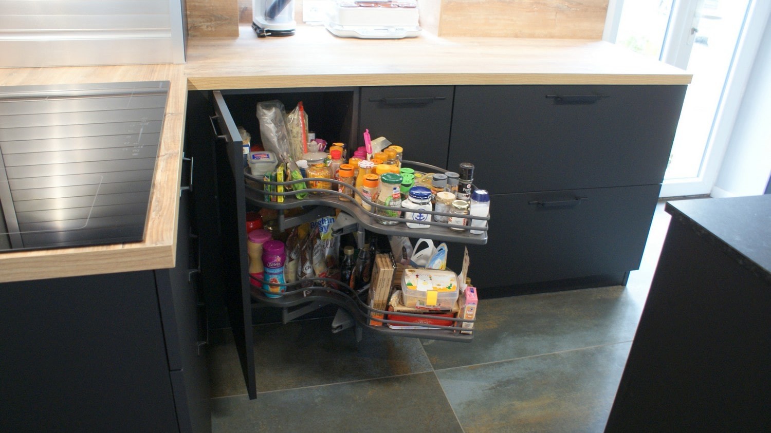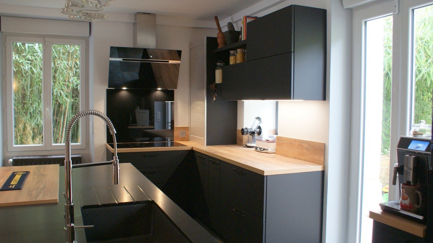 Nos clients souhaitaient une atmosphère à la fois cosy et élégante avec des façades noires. Si ce coloris signe indéniablement un design moderne, seul un choix de matériaux adaptés garantit un entretien aisé. Pour répondre aux exigences des couleurs sombres et mates nous recommandons, comme pour cette réalisation, des façades en Fenix NTM®. Le Fenix est un matériau ultra-mat, anti traces, antistatique, réparable et facile l’entretien. Un rinçage régulier à l’eau claire chaude suffit à le maintenir propre.
